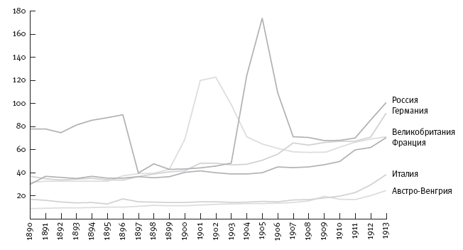 Рисунок 3. Военные расходы европейских стран, 1890–1913 гг. (сопоставимые цены; млн ф. ст.)