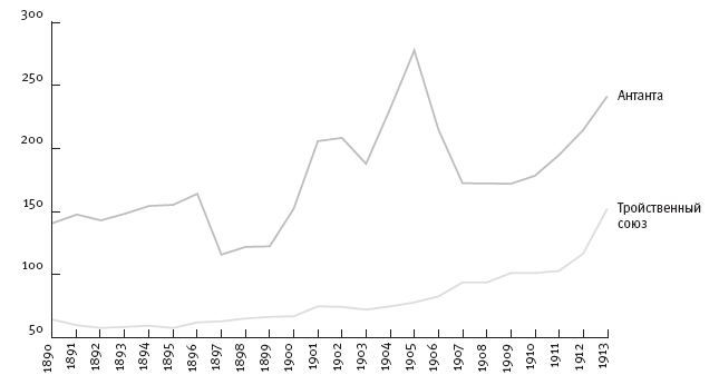 Рисунок 4. Военные расходы двух европейских военно-политических блоков, 1890–1913 гг. (млн ф. ст.)
