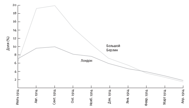 Большая доля данных Бекера относится к сельским районам Франции. Имеются свидетельства, что охваченная патриотическим пылом толпа в 1914 году была явлением сугубо городским. Но и здесь есть поводы для скепсиса. Кроме прочего, следует иметь в виду, что после начала войны в городском хозяйстве немедленно начался экономический спад. В Берлине уровень безработицы среди членов профсоюзов вырос с 6 % (июль 1914 года) до 19 % (август), а в сентябре достиг пика: почти 29 %. В Лондоне уровень безработицы среди рабочих, охваченных национальной системой страхования, выросло с 7 до 10 % (рис. 8). Эти показатели почти наверняка не отражают действительный уровень общей безработицы, поскольку поденщики (как правило, не имевшие членства в профсоюзе и страховки) могли лишиться работы в первую очередь. Сильнее всего пострадал Париж – не в последнюю очередь потому, что столицу покинуло много нанимателей. В августе общая занятость в Парижском регионе [Иль-де-Франс] снизилась почти на 71 %. Хотя во многом к этому привел уход рабочих на фронт, в октябре не менее 300 тысяч парижан зарегистрировалось как безработные: это около 14 % занятого населения города{1012}.