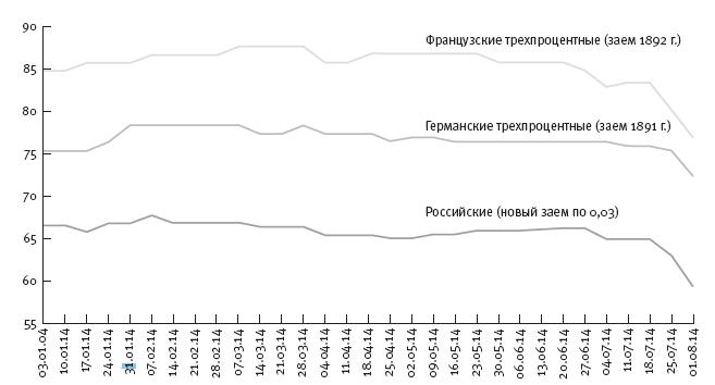 Рисунок 9. Еженедельные заключительные цены государственных облигаций стран континентальной Европы на Лондонской бирже в 1914 г.