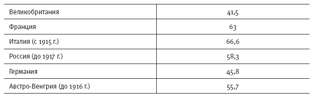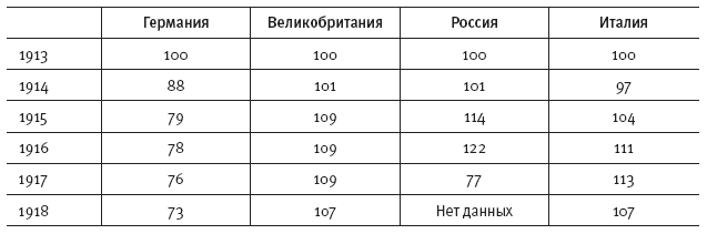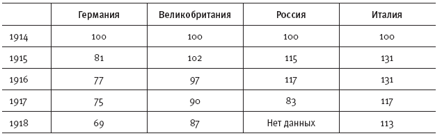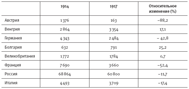 источники: Mitchell, European Historical Statistics, pp. 409–416; Stone Eastern Front, p. 209; Witt, Finanzpolitik, p. 424. Ляшенко приводит для России меньшие показатели. См.: Lyaschenko, ational Economy, p. 697.