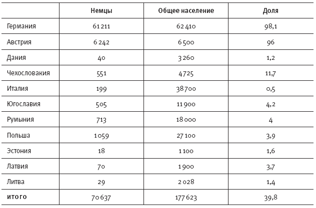 Помимо того, что в результате американский Сенат отказался ратифицировать Версальский договор, с принципом самоопределения была связана фатальная проблема, заключавшаяся в этнической разнородности Центральной и Восточной Европы, и в особенности в существовании за пределами Германии многочисленной германской диаспоры. Таблица 46 показывает приблизительное распределение немецкоязычного населения в Центральной и Восточной Европе в 1919 году. Мы видим, что за послевоенными границами Германии оказались по меньшей мере 9,5 миллиона немцев – примерно 13 % всего немецкоязычного населения. Эта цифра станет еще больше, если учесть немцев Эльзаса и Лотарингии, Советского Союза (так называемых поволжских немцев) и сообщества с немецким самосознанием за пределами континентальной Европы. На деле Ассоциация германской культуры за рубежом после 1918 года считала, что вне Германии проживают почти 17 миллионов немцев, а нацистская пропаганда позднее говорила о целых 27 миллионах.