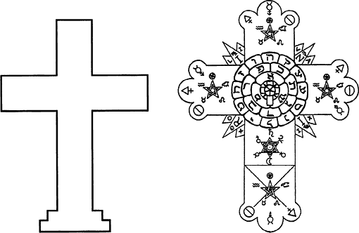 Один из этих символов представляет собой распятие, а другой – крест с розой Ордена Золотой Зари. Посмотрите на каждый из них (рис. 1) в течение минуты, а затем запишите все, что приходит к вам на ум. Списки, которые у вас получатся, могут быть совершенно различны. Например, члены группы, которым на семинаре было предложено выполнить данное упражнение, сказали, что получили больше интеллектуальной информации, чем духовной, от изображения креста Ордена Золотой Зари, и почувствовали, что чистота простого креста предоставила им больше духовной информации, чем интеллектуальной.