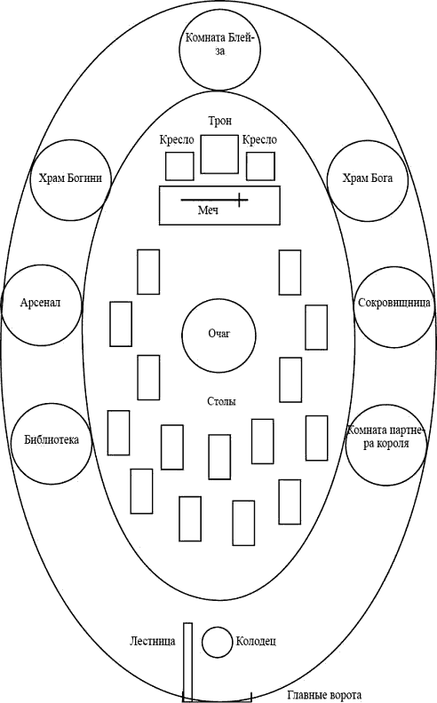 Когда туман рассеялся, вы увидели очаг на земляном полу, в котором потрескивает огонь. Дым от него поднимается вверх и выходит наружу – через отверстие в крытой соломой крыше. Вокруг очага расположены грубо сколоченные столы и стулья. Пол прикрыт свежей соломой. Вы находитесь в просторном зале. Позади вас стоит длинный стол с большим креслом во главе его. Это ваше кресло.