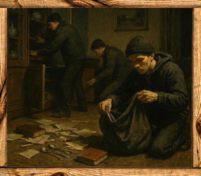 Чуть ли не на цыпочках они прошли в гостиную следом за зверем. Перевернуто здесь было изрядно: скатерти, вышитые салфетки, книги, бумаги какие-то из шкафов вытаскивали, скидывая на пол, столовые приборы – не серебро, недорогой мельхиор – поблескивали в открытых ящиках. Их не тронули, разобрались, что овчинка выделки не стоит.