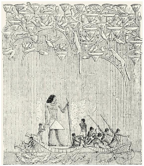 Плавание в зарослях тростника. Рельеф из гробницы Ти в Саккаре. Прорисовка.