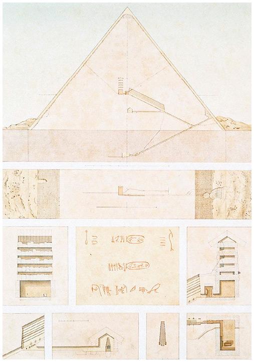 Погребальный комплекс Хуфу (Хеопса). Схема расположения внутренних помещений пирамиды и строительные надписи с картушами царя.