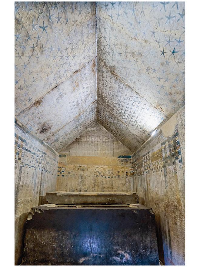 К концу эпохи правления V династии происходит еще одно важное событие: в погребальной камере царя появляются заупокойные тексты. Их вырезают на стенах погребальной камеры и аванкамеры, чтобы помочь царю воскреснуть и присоединиться к сонму богов. Эти надписи называются «Тексты Пирамид», и впервые они появляются в Саккаре, в погребении Униса, последнего царя V династии. В те времена сохраняется также представление о том, что у царя должен быть дворец, как это было еще в пирамиде Джосера. Вероятно, поэтому стены вокруг саркофага Униса декорируются «дворцовыми фасадами» – раскрашенными рельефами, имитирующими стены архаического тростникового дворца.