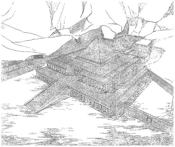 [Закрыть]. Здесь, рядом с пристанью, возводился Нижний храм. В этом храме тело царя подготавливали к погребению: омывали, мумифицировали, проводили ритуал отверзания уст и очей. В храме также находились статуи правителя.