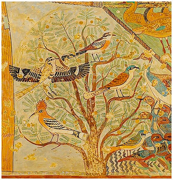 В гробнице номарха Хнумхотепа II сохранилось изображение акации – удивительное по изяществу работы и сбалансированности композиции. На ветвях дерева сидят птицы разных видов с ярким оперением. Во дворе перед входом в гробницу находится шахта, из которой пробит длинный недекорированный коридор, расположенный под полом молельни и ведущий в погребальную камеру.