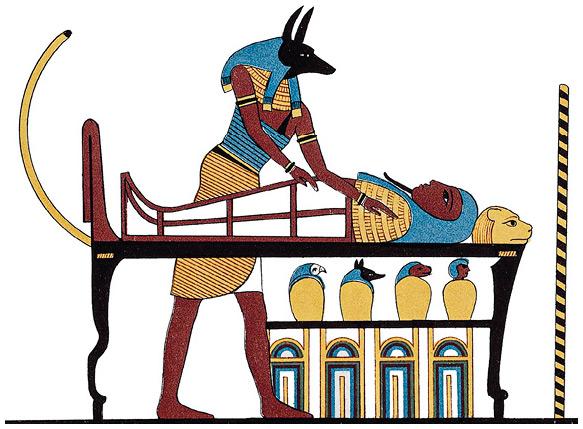 «Наложение рук» Анубисом на мумию. Под погребальным ложем – канопы и ящички для ушебти. Рисунок Е. А. Фипсона.