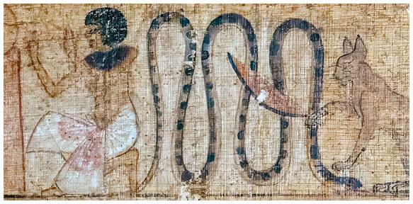 Сцена из папируса «Книги Мертвых» Кенны. Ра в образе кота разрубает змея Апопа.
