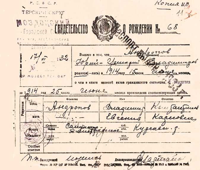 Но стоит отметить и запомнить – первоначальные сведения, указанные Андроповым в марте 1932 года при поступлении в техникум, скорее всего, самые точные и верные. Кстати, именно тогда, собирая документы, он получил в горсовете и копию свидетельства о своем рождении. А вот потом пошла чехарда и чересполосица в датах и фактах во множестве заполненных Андроповым бумаг. Но ведь о чем-то это говорит. Как будто он сознательно путает следы, пытается сбить с толку желающих копаться в его биографии и искать подробности о его матери и отце. Несомненно – было что скрывать!