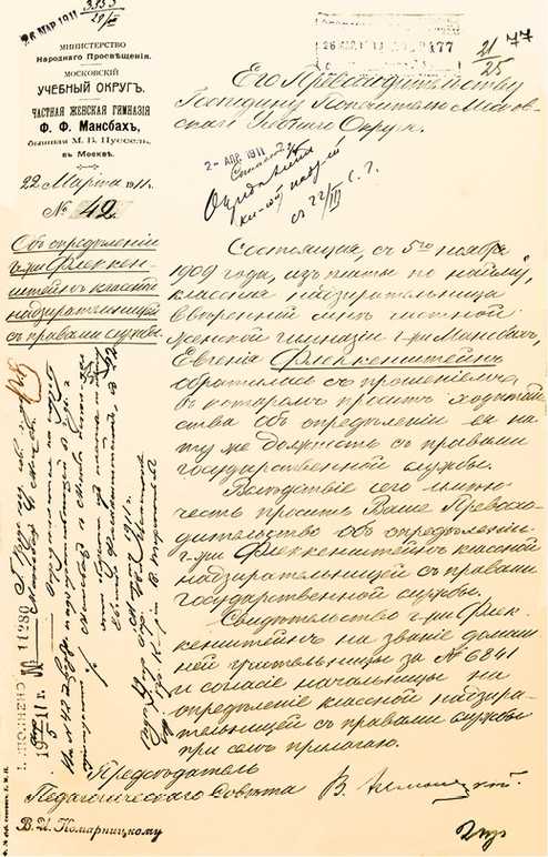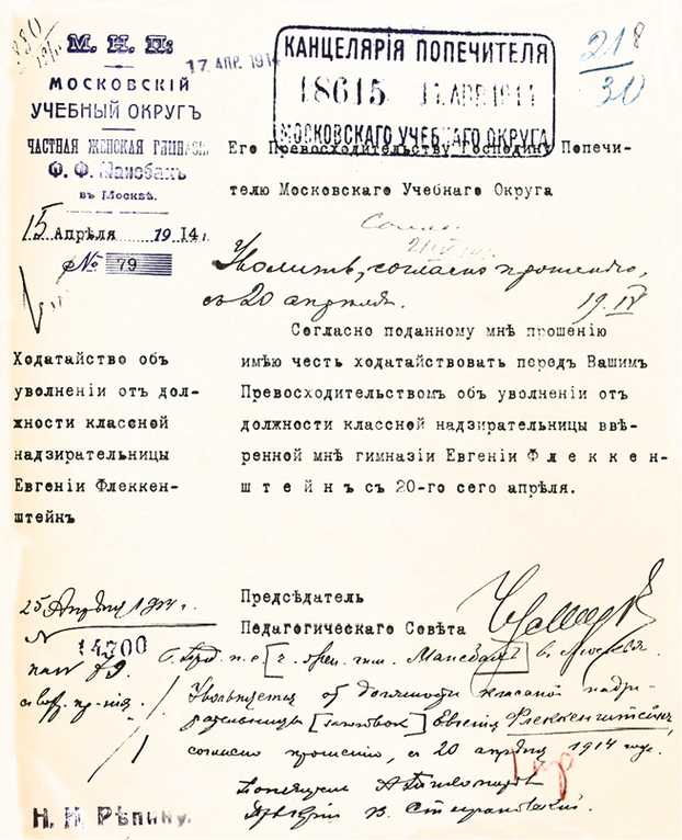 Можно точно сказать, до какого времени Евгения Карловна работала в гимназии. Она уволилась согласно собственному прошению с 20 апреля 1914 года. Письмом гимназии № 79 от 15 апреля об этом был уведомлен попечитель Московского учебного округа[127]127