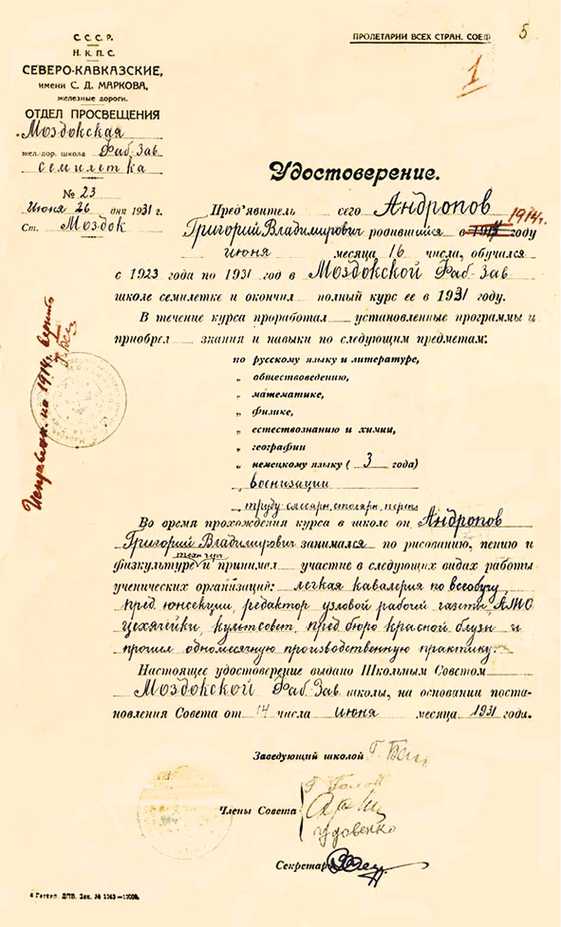 Как многие искренне считают, верить можно только документам, да и то, если есть уверенность, что они не поддельные. Вот один из самых ранних подлинных документов в личном деле: 26 июня 1931 года на имя Андропова Григория Владимировича (дата рождения указана 16 июня 1914 года) выдано удостоверение об окончании Моздокской фабрично-заводской школы-семилетки, в которой он обучался с 1923 по 14 июня 1931 года[150]150