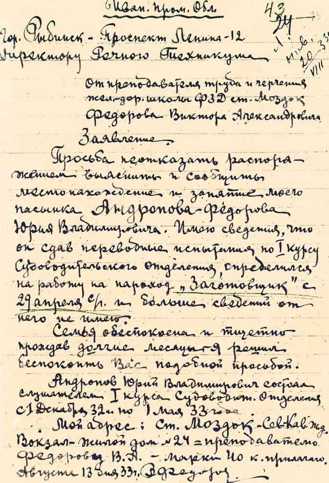 Необходимые для поступления документы Андропов отправил в Рыбинск 22 марта 1932 года. Приложил отличные характеристики и, разумеется, письмо от секретаря партийной ячейки и профорга станции Моздок, ходатайствующих о его приеме в техникум «как одного из самых активных работников»[159]159