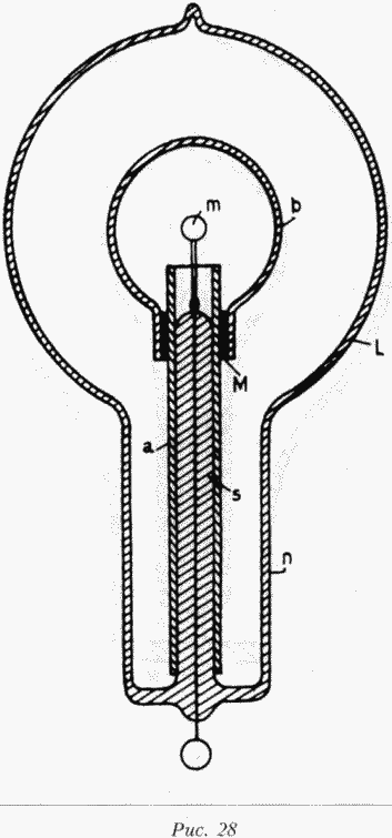 Колба L в данном случае имеет горловину п, достаточно широкую для того, что через нее прошла маленькая колба Ъ. В противном случае конструкция будет такой же, как показано на рисунке 18. Маленькая колба размещена на стеклянной ножке s, на которой есть тугоплавкая головка т. От алюминиевой трубки а ее отделяют несколько слоев слюды М для того, чтобы не допустить трещин стеклянной ножки вследствие резкого нагревания алюминиевой трубки при внезапном включении катушки. Если требуется производить свет только за счет накаливания электрода, то внутренняя колба должна быть как можно меньше. Если желательно вызвать фосфоресценцию, то она должна быть побольше, иначе она может нагреваться и свечение прекратится. В такой конструкции обычно только в маленькой колбе возникает фосфоресценция, так как внешняя колба практически не подвергается бомбардировке.