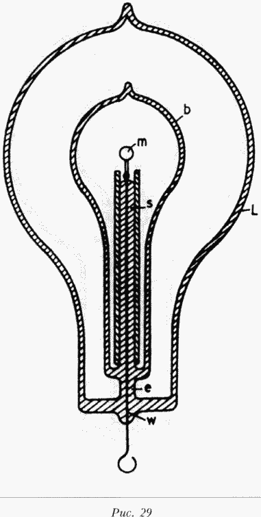 В некоторых лампах, показанных на рисунке 28, маленькие трубки были выкрашены фосфоресцирующей краской и получались прекрасные световые эффекты. Вместо того чтобы увеличивать размер внутренней колбы и избежать преждевременного нагрева, целесообразно взять больший электрод т. Это ослабит бомбардировку по причине меньшей электрической плотности.