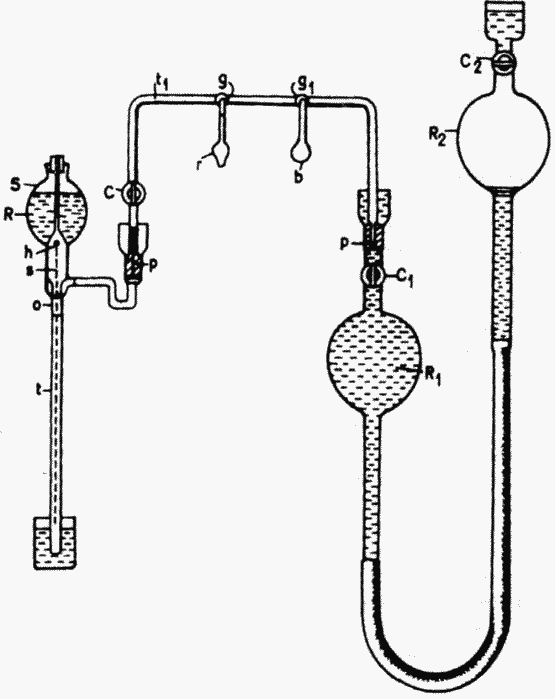 В целом процесс откачки воздуха выглядел так: вначале, когда запорные краны С и C1 открыты, а все остальные сочленения закрыты, резервуар R2 был поднят так высоко, что ртуть заполнила резервуар R1и узкую часть U-образной трубки. Когда помпа начинала работать, ртуть, конечно, быстро поднималась в трубке, а резервуар R2, опускался, причем исследователь удерживал ртуть примерно на том же уровне. Резервуар R2 уравновешивался длинной пружиной, которая облегчала эту работу, а трения частей было до-статочно, чтобы удерживать его в любом положении. Когда насос Шпренгеля заканчивал свою работу, резервуар R2 опускался еще ниже и уровень ртути в R1 опускался и она заполняла R2, после чего клапан С2 закрывался. Воз-дух, прижатый к стенкам R1, и воздух, поглощенный ртутью, выпускался, и чтобы освободить ртуть от всего воздуха, резервуар R2 много раз опускался и поднимался. Во время этого процесса некоторое количество воздуха, которое собиралось под запорным краном С2, выгонялось из R2 путем опускания его достаточно низко и открывания крана; кран закрывался перед тем, как поднять сосуд. Когда весь воздух был удален из ртути и больше не скапливался в R2, его опускали и прибегали к помощи едкого кали. Теперь резервуар R2 был снова поднят, пока ртуть в R1не устанавливалась выше крана С1 Поташ плавили и кипятили, и влага частично устранялась насосом, а частично реадсорбировалась; и этот процесс нагрева и охлаждения повторялся много раз, и каждый раз после того, как влага впитывалась или выгонялась, резервуар R2 много раз поднимали и опускали. Таким образом из ртути удалялась вся влага и оба резервуара были готовы к работе. Тогда резервуар R2 поднимался в верхнее положение и помпу включали на длительный срок. Когда достигалась наивысшая степень вакуума, колба с поташ ем оборачивалась хлопковой тканью, пропитанной эфиром, для того, чтобы держать ее при низкой температуре, затем резервуар R2 опускали и, после того как резервуар R1 опустел, приемник г быстро закупоривали.