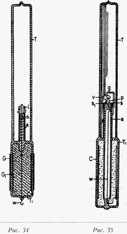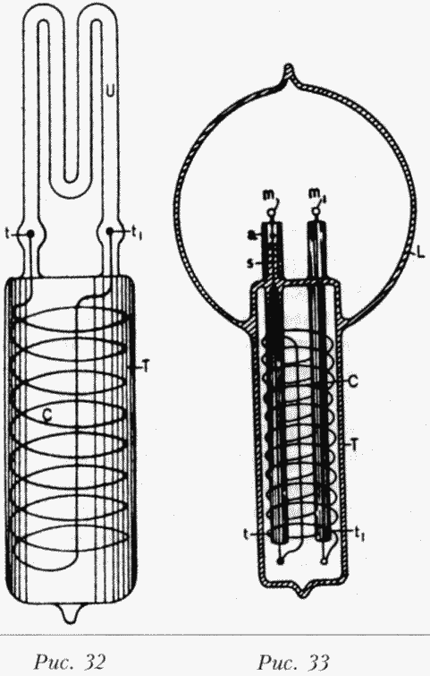 На рисунке 33 показана лампа другой конструкции. На этот раз трубка Т запаяна в колбе L. Трубка содержит обмотку С, которая проходит сквозь маленькие трубки t и t, которые припаяны к трубке Т. Две тугоплавкие головки m и m укреплены на нитях накаливания, соединенных с концами проводов, проходящих через стеклянные трубочки t и tf. В целом в лампах, изготовленных по этой схеме, колба L сообщалась с трубкой Т. Для этой цели концы трубочек t и t1были немного оплавлены горелкой, чтобы держать провод, но не мешать сообщению. Трубка Т с маленькими трубками и проводами в них и тугоплавкие головки m и m1были сначала приготовлены, а затем запаяны в колбу L, после чего внутрь была помещена обмотка С и к ее концам присоединены провода. Затем трубка была плотно набита изолирующим порошком, закрыта и на конце оставлено лишь небольшое отверстие, куда досыпали порошок, а потом и его закрыли. Обычно в лампах, изготовленных в соответствии с рисунком 33, на кончики s трубок t и tfнадевались алюминиевые трубочки а для защиты от нагрева. Головки т и т1можно было довести до любой степени накала, пропуская по обмотке С разряды лейденских банок. В таких лампах с двумя головками происходит любопытный эффект образования теней каждой головки.