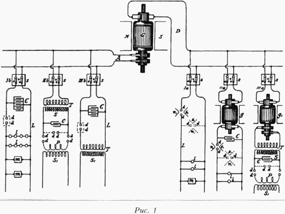 Эти высокочастотные токи получаются особым способом. Применяемая методика была предложена мною около двух лет назад во время лекции в Американском институте электроинженеров. Несколько способов, практикуемых в лабораторных условиях, получения таких токов из постоянного или низкочастотного переменного тока показаны на рисунке 1, который будет позже подробно описан. В целом необходимо заряжать конденсаторы от источника постоянного или переменного тока, желательно высокого напряжения, и разряжать их пробивным разрядом, соблюдая при "этом необходимые условия колебания тока. Ввиду всеобщего интереса, проявляемого к токам высокой частоты и эффектам, которые они порождают, мне кажется желательным немного задержаться на этом методе преобразования. Для того чтобы дать вам ясную картину происходящего, я предположу, что применение источника постоянного тока, часто очень удобно. Желательно, чтобы генератор давал такое высокое напряжение для возможности произвести разряд между контактами на небольшом расстоянии в воздухе. Если этого не происходит, следует прибегнуть к помощи вспомогательных устройств, некоторые из которых будут описаны позже. Когда конденсаторы заряжаются до определенного потенциала, воздух, или изолирующее пространство, пробивается и происходит разряд. Тогда происходит резкий бросок тока, то есть расходуется большое количество накопленной электрической энергии. Затем конденсаторы заряжаются, и такой же процесс повторяется более или менее быстро. Для производства таких резких бросков тока необходимо соблюдать определенные условия. Если скорость разряда конденсаторов соответствует скорости зарядки, то в таком случае ясно, что конденсаторы в процессе не участвуют. Если скорость разряда меньше скорости зарядки, то и тогда конденсаторы не могут играть важной роли. Но если, напротив, скорость разряда выше скорости зарядки, тогда достигается последовательность резких бросков тока. Очевидно, если скорость, с которой энергия рассеивается во время разряда, намного выше скорости подачи энергии на конденсаторы, внезапные разряды будут немногочисленными, между ними будут большие интервалы. Это всегда происходит, когда конденсатор большой емкости заряжается сравнительно слабым устройством. Если скорости заряда и рассеивания не различаются сильно, тогда разряды будут происходить более быстро и часто, и тем быстрее и чаще, чем меньше разница в скорости, до тех пор, пока скорость и частота разрядов не достигнут ограничений, присущих каждому отдельному случаю и зависящих от ряда причин. Таким образом, от источника постоянного тока мы можем получить последовательность разрядов желаемой скорости. Конечно, чем выше напряжение, выдаваемое генератором, тем меньше должна быть емкость конденсаторов и, в основном, по этой причине лучше использовать генератор высокого напряжения. Кроме того, такой генератор позволяет получить более высокую скорость колебаний.