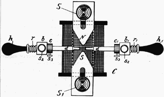 Вариант такого разрядника, который оказался удобным в использовании и применялся в нескольких опытах, в частности, для преобразования постоянного тока, показан на рисунке 2. NS – это полюса очень сильного магнита, возбуждаемого катушкой с. Полюсные наконечники имеют отверстия для регулировки и закрепляются в нужном положении винтами ss1Штоки разрядника dd1, заостренные на концах, для того чтобы приблизиться к зубцам полюсов, проходят через медные муфты bb1и крепятся винтами s2s2Пружины rr1 шайбы сс, надеты на штоки, причем шайбы служат для установки концов штоков на определенном приемлемом расстоянии при помощи винтов s3s3, а пружины – для разведения концов. Когда необходимо получить дугу, надо ударить легонько по одной из резиновых рукояток hh1 тогда концы штоков соприкасаются, но сразу разводятся пружинами rr1Такая конструкция хорошо зарекомендовала себя, когда эдс была недостаточна для пробоя между контактами, она также позволяет избежать короткого замыкания генератора металлическими концами штоков. Скорость прерывания тока магнитом зависит от напряжения магнитного поля и разности потенциалов на концах дуги. Прерывания обычно столь часты, что вызывают музыкальный сигнал. Несколько лет назад было замечено: когда мощная катушка индуктивности разряжается между полюсами сильного магнита, во время разряда раздается звук сродни пистолетному выстрелу. Было сделано туманное замечание относительно того, что искра усиливалась наличием магнитного поля. Теперь стало ясно, что ток пробоя, текущий некоторое время, прерывается много раз, что и порождает звук. Это явление особенно заметно, когда цепь возбуждения большого магнита или динамо-машины разрывается мощным магнитным полем.