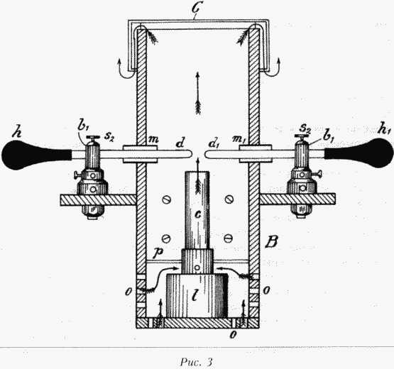 Разрядник другой формы, также с успехом применяемый в отдельных случаях, показан на рисунке 3. В данном случае стержни разрядника ddf проходят через отверстия в деревянном коробе В, который на внутренней поверхности имеет толстый слой слюды, что обозначено на рисунке жирными линиями. Отверстия снабжены слюдяными гильзами mm1некоей толщины, которые, по возможности, не должны касаться стержней dd. Короб снабжен крышкой с, окружность которой несколько больше самого короба. Искровой промежуток подогревается лампой l, установленной внутри короба. Пластина р над лампой позволяет потоку воздуха проходить только через воздуховод лампы е, а подача воздуха происходит через отверстия оо над днищем короба, причем воздух движется в направлении, указанном стрелками. Во время работы разрядника крышка короба закрыта, так что свет дуги не виден снаружи. Желательно исключить свечение, насколько это возможно, так как оно мешает проведению некоторых экспериментов. Разрядник такой конструкции очень прост и эффективен, если с ним правильно обращаться. Когда воздух нагревается до определенной температуры, он теряет свои свойства изолятора; становится слабым диэлектриком, и последствия этого таковы, что дуга устанавливается на большем расстоянии. Дуга, естественно, должна быть в достаточной степени изолятором, чтобы разряд проходил резко. Дуга, сформированная при таких условиях, довольно длинная, может быть достаточно чувствительной, и слабого тока воздуха через воздуховод с достаточно, чтобы произвести быстрые прерывания. Настройка производится путем регулирования температуры и скорости потока воздуха. Вместо использования лампы целей эксперимента можно достичь, добиваясь потока теплого воздуха другими способами. Очень простой метод, который уже применялся, – поместить дугу в длинную вертикальную трубку, сверху и снизу ограниченную пластинами для регулировки температуры и скорости потока воздуха. Следует предпринять меры для устранения звука.