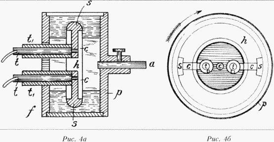 Полый металлический шкив Р (рисунок 4а) был укреплен на валу а, который вращался со значительной скоростью при помощи соответствующего механизма. Внутри шкива, но не соприкасаясь с ним, был установлен тонкий диск h (показанный толстым для ясности рисунка) из твердой резины с впрессованными металлическими сегментами ss, имеющими металлические выступы ее, к которым привинчены провода tt, покрытые тонким слоем резины t1t1. Резиновый диск h с металлическими сегментами ss был обработан на токарном станке и вся его поверхность тщательно отполирована для того, чтобы уменьшить трение при вращении в жидкости. В полый шкив было залито масло так, чтобы заполнить все пространство вплоть до отверстия, оставленного во фланце / на передней части шкива, которое тщательно завинтили. Выводы tt соединили с противоположными слоями батареи конденсаторов так, чтобы разряд происходил в жидкости. При вращении шкива жидкость прижималась к ободу и создавалось значительное давление. Таким простым способом искровой промежуток заполнялся средой, которая вела себя практически как твердое тело и имела свойство мгновенно восстанавливаться после разрыва и, кроме того, циркулировала в искровом промежутке с огромной скоростью. При помощи таких разрядников с жидким прерывателем были получены очень мощные явления, причем эти разрядники были созданы в нескольких вариантах. Было обнаружено, как и ожидалось, что при данной длине провода можно получить более длинную искру, если применять для прерывания воздух. В целом скорость, а следовательно, и давление жидкости, были ограничены трением жидкости в описанном разряднике, но скорости, получаемой на практике, было более чем достаточно для производства разрядов, приемлемых для обычных цепей. В таких случаях металлический шкив Р изнутри имел зубцы и тогда возникало несколько пробоев, количество которых можно было высчитать, исходя из скорости вращения шкива. Эксперименты проводились с использованием жидкостей с разной изолирующей способностью с целью снижения потерь в дуге. Если изолирующую жидкость немного подогреть, потери в дуге снижаются.
