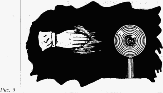Я могу сделать так, чтобы эти потоки стали видны всем, прикоснувшись металлическим предметом одного из выводов, а другую руку поднеся к металлическому шару, который соединен с другим выводом катушки. По мере приближения руки воздух между ней и шаром, а также вокруг, возбуждается более интенсивно, и вы видите, как потоки света устремляются с моих пальцев и со всей ладони (рисунок 5). Если бы я поднес руку ближе, возникло бы мощное искрение, что могло бы привести к травме. Стримеры не причиняют боли, за исключением того, что на кончиках пальцев чувствуется жжение. Не стоит путать эти потоки с теми, что образуются от электрофорного генератора, так как во многом те и другие ведут себя по-разному. Я присоединил шар и пластину к одному из выводов для того, чтобы избежать образования видимых потоков на этом выводе, а также чтобы предотвратить искрение на большом расстоянии. Кроме того, с такой конструкцией катушка работает лучше.