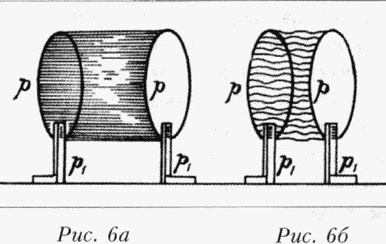 На примере покажу вам различие эффектов, получаемых от быстро меняющейся и постоянной или умеренно меняющейся силы. Здесь у меня две круглые медные пластины рр (рисунки 6а и 66), установленных на изолирующих подставках на столе, и соединенных с вторичной обмоткой катушки, подобной той, что мы применяли в последний раз. Я ставлю пластины на расстоянии 10–12 дюймов друг от друга и включаю катушку. Вы видите, что всё пространство между пластинами, около двух кубических футов, заполнено однородным светом (рисунок 6а). Этот свет образуют потоки, которые вы наблюдали в предыдущем опыте, но которые сейчас гораздо интенсивнее. Я уже говорил о важности этих потоков для использования в коммерческих устройствах, но еще более они важны для постановки чисто научных экспериментов. Часто они слишком слабы, чтобы их заметить, но они всегда есть, и они потребляют энергию и изменяют действие устройств. При такой интенсивности, как сейчас, они в большом количестве производят озон и, как отметил профессор Крукс, азотистую кислоту. Химическая реакция настолько стремительна, что если катушку, такую, как наша, оставить работать достаточно долго, то атмосфера в комнате станет невыносимой, настолько сильно будет воздействие на глаза и горло. Но если потоки производить в умеренном количестве, они прекрасно освежают воздух и производят, несомненно, благоприятный эффект.
