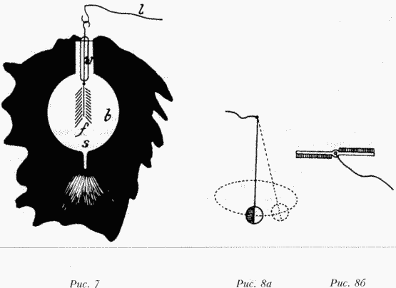 Когда проводник помещен в воздух или подобную изолирующую среду, состоящую или содержащую мелкие, свободно движущиеся частицы, способные электризоваться, и когда электризация тела подвергается быстрому изменению, – что соответствует тому, что электростатическая сила, действующая вокруг тела меняет интенсивность, – мелкие частицы притягиваются и отталкиваются и их сильные удары могут вызвать механическое движение тела. На явления такого рода стоит обратить внимание, так как они не наблюдались ранее, когда применялась обычная аппаратура. Если очень легкий шарик из проводника подвесить на крайне тонком проводе и зарядить до любого постоянного потенциала, пусть и очень высокого, шарик останется в покое. Даже если потенциал будет быстро меняться, при условии, что небольшие частицы материи, молекулы и атомы, равномерно распределены, это не приведет к движению шарика. Но если одну сторону шарика покрыть толстым слоем изоляции, удары частиц заставят его двигаться по неровной траектории (рисунок 8а). Таким же образом крыльчатка, изготовленная из тонкого металла и частично покрытая слоем изоляции, как описывалось ранее, соединенная с выводом катушки, начинает вращаться.
