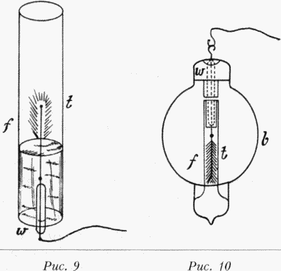 Все эти явления, которые вы наблюдали, а также те, которые будут продемонстрированы позже, имеют место благодаря присутствию такой среды, как воздух, и были бы невозможны в непрерывной среде. Действие воздуха еще лучше можно проиллюстрировать следующим опытом. Я беру стеклянную трубку t (рисунок 9) диаметром, примерно, 1 дюйм, в нижнем конце которой находится запаянный в стекло платиновый провод, к которому присоединена тонкая нить накаливания f. Я соединяю провод с выводом катушки и включаю ее. Платиновый провод теперь электризуется попеременно положительно и отрицательно, и сам провод и воздух в трубке быстро нагреваются от ударов частиц, которые могут быть настолько сильными, что нить быстро накаляется.