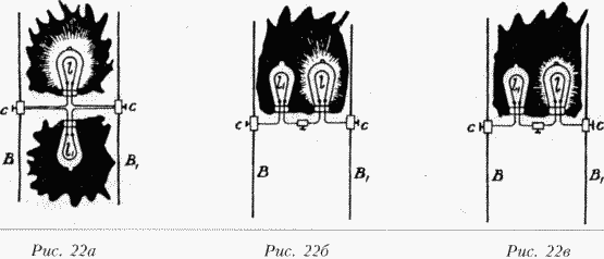 На этом этапе лекции мне бы хотелось коснуться еще одной интересной особенности, которая демонстрирует эффект скорости изменения потенциала тока. Теперь я оставлю лампы соединенными последовательно с брусками BBf, как и в предыдущем опыте (рисунок 226), но значительно понижу частоту тока, которая в предыдущем опыте была очень высокой. Этого я могу добиться, включив последовательно в цепь разряда катушку индуктивности или нарастив емкость конденсаторов. Когда я теперь пропускаю низкочастотные заряды через нити, вакуумная лампа светится, как и прежде, но заметно, что негерметичная лампа тоже светится, хотя и не так ярко, как первая. Уменьшив силу тока в лампах, я могу заставить нить в негерметичной лампе быть тускло красной, и, хотя нить в вакуумной лампе светится ярко (рисунок 22в), степень накала уже гораздо меньше, чем на рисунке 226, когда ток был гораздо большей частоты.