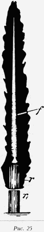 Хочу привести результат, которого добился благодаря наблюдениям во время этих опытов, и который очень интересен. Я заметил, что небольшие различия в плотности воздуха приводили к серьезной разнице в степени накала нитей, и подумал: так как в трубке, через которую проходит световой разряд, плотность газа неоднородна, то очень тонкий провод, помещенный внутрь, может накаляться в местах меньшей плотности газа и в то же время оставаться темным в местах большей плотности, где конвекция сильнее, а бомбардировка менее интенсивна. В соответствии с этой мыслью была приготовлена трубка (;, как показано на рисунке 23, через центр которой проходил очень тонкий платиновый провод w. Из трубки был частично откачан воздух, и было обнаружено, что когда ее соединяли с выводом высокочастотной катушки, платиновый провод и в самом деле накалялся участками, как показано на рисунке 23. Позже было изготовлено несколько таких трубок с одним или несколькими проводами, и каждая из них показывала одинаковый результат. Этот эффект был особенно заметен, когда появлялся полосчатый разряд, но также имел место, когда полосы не были заметны, что говорило о том, что плотность газа в трубке неоднородна. Полосы обычно располагались так, что места наибольшего разрежения соответствовали участкам наибольшего или большей яркости свечения провода w. Но через несколько мгновений становилось заметным, что яркие участки провода покрыты плотными полосами разряда, как показано буквами // на рисунке 23, хотя это явление и было трудноразличимо. Это логично объяснялось, если предположить, что конвекция не сильно различалась на плотных и разреженных участках, а бомбардировка была сильнее на плотных участках полосчатого разряда. В лампах, на самом деле, можно часто наблюдать такую картину, когда тонкий провод накаляется сильнее, если газ не сильно разрежен. Так случается, когда потенциал катушки недостаточен для вакуума, но такой результат можно объяснить разными причинами. Во всяком случае, это любопытное явление накаливания исчезает, когда трубка, или, скорее, провод в трубке равномерно нагревается.