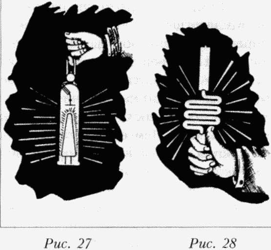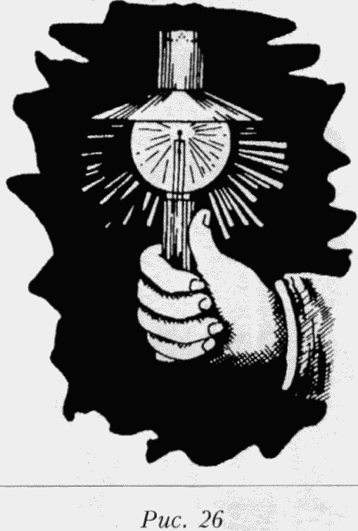 Сначала, как и в предыдущих опытах, я соединяю свое тело с одним из выводов высоковольтного трансформатора и беру в руку вакуумную лампу, в которой помещается небольшая углеродная головка, размещенная на конце платинового провода, идущего наружу, и головка накаляется, как только трансформатор включают (рисунок 26). Сверху на лампу я могу положить абажур из проводника для усиления действия, но это необязательно, необязательно также, чтобы головка накаливания была соединена с рукой посредством провода, идущего наружу сквозь стекло, так как достаточное количество энергии для накаливания головки можно передать сквозь стекло при помощи индукции. Затем я беру лампу с сильным вакуумом, в которой находится фосфоресцирующееся тело, поверх которого размещается небольшая алюминиевая пластина на платиновом проводе, ведущем наружу, и ток, проходящий сквозь мое тело возбуждает сильное свечение в лампе (рисунок 27). Теперь я вновь беру в руку простую вакуумную трубку, и вновь точно так же газ внутри трубки начинает светиться (рисунок 28). И наконец, я беру в руку провод, неважно, оголенный или изолированный: электрические вибрации настолько сильны, что покрывают провод светящейся пленкой (рисунок 29).