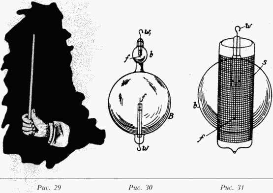 В конструкциях маленькая лампа внутри, по крайней мере на первых порах, препятствовала бомбардировке внешней колбы. Мне пришла мысль проверить, как поведет себя в таких условиях металлическое сито, и я приготовил для этого несколько ламп, которые показаны на рисунке 31. В колбе Ь была расположена тонкая нить f (или головка) на платиновом проводе, проходящем сквозь стеклянную ножку и ведущем наружу. Нить / была окружена ситом s. Экспериментально было обнаружено, что в таких колбах сито с крупными ячейками ни в коей мере не препятствовало бомбардировке колбы Ь.