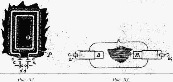 Ясно, что на них можно воздействовать при помощи электростатической силы, как следует из всех этих опытов. Меняя электростатическую силу, мы можем возбудить атомы, заставить их соударяться, что сопровождается выделением тепла и света. Вне всякого сомнения, никто еще не продемонстрировал, как можно на них воздействовать иначе. Если через закрытую вакуумную трубку пропустить световой разряд, то последуют ли атомы в своей организации какой-либо другой силе, кроме электростатической, которая действует напрямую, от атома к атому? Совсем недавно я исследовал взаимодействие двух контуров с крайней степенью вибрации. Когда батарея из нескольких банок (ccc1c1, рисунок 32) разряжается через первичную обмотку Р низкого сопротивления (соединения такие, как показаны на рисунках 19а, 196, 19в, а частота колебаний составляет несколько миллионов, в точках на первичной обмотке, отстоящих друг от друга всего на несколько дюймов, возникает огромная разность потенциалов. Эта разность может составлять 10 000 вольт на дюйм, если не более, принимая максимальное значение эдс. На вторичную обмотку S1следовательно, действует электростатическая индукция, которая в крайних случаях гораздо важнее, чем электродинамическая. Для таких резких импульсов первичная обмотка, как и вторичная, плохие проводники, следовательно, огромная разность потенциалов может порождаться электростатической индукцией между соседними точками вторичной обмотки. Затем между проводами могут проскакивать искры и в темноте станут видимы потоки, если не допустить через промежуток dd разряда. Теперь, если мы заменим вторичную обмотку S герметичной вакуумной трубкой, то разности потенциалов в трубке, созданной электростатической индукцией, сполна хватит, чтобы возбудить некоторые ее участки; но так как точки определенной разности потенциалов в первичной обмотке не фиксированы, а постоянно меняют положение, в трубке появляется светящаяся полоса, которая очевидно не касается стекла, хотя и должна была бы, если бы точки минимума и максимума потенциала имели фиксированное положение на первичной обмотке. Я не исключаю возможности того, что эта трубка возбуждается исключительно благодаря электродинамической индукции, поскольку этого взгляда придерживаются очень опытные физики; но, по моему мнению, еще нет положительных доказательств того, что атомы газа в закрытой трубке могли расположиться в такие цепочки под действием электродвижущего импульса, порожденного электродинамической индукцией в трубке. Мне еще не удавалось пока получить полосы в трубке, какой бы длинной она ни была, и какой бы вакуум в ней ни был создан, то есть полосы под прямым углом к предполагаемому направлению разряда или оси трубки; но отчетливо наблюдал в большой колбе, где широкая светящаяся полоса появлялась после разряда батареи через провод, опутывающий лампу, слабый световой круг между двумя полосами, одна из которых была интенсивнее другой. Более того, мой опыт говорит мне, что такой газовый разряд в закрытой трубке не может вибрировать, то есть вибрировать как единое целое. Я убежден, что ни один разряд, проходящий в газе, не может вибрировать. Атомы газа ведут себя очень любопытно по отношению к внезапным электрическим импульсам. Видимо, газ не обладает ощутимой инерцией по отношению к таким импульсам, ибо н
