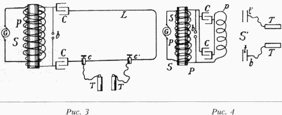 Одной из наиболее важных особенностей токов высокой частоты, или, выражаясь обще, быстро меняющихся токов, является то, что они с трудом проходят по толстым проводникам с большой самоиндукцией. Препятствие, которое представляет собой самоиндукция для прохождения этих токов, настолько велико, что оказалось практически возможным, как обнаружено во время ранних опытов и о чем уже говорилось, поддерживать разность потенциалов в несколько "тысяч вольт между точками – на расстоянии не более нескольких дюймов друг от друга – на толстом медном бруске, имеющем ничтожно малое сопротивление. Такое наблюдение, естественно, привело к созданию конструкции, показанной на рисунке 3. Источником высокочастотных импульсов в данном случае служит уже известный нам трансформатор, питающийся от генератора G, подающего обычный постоянный или переменный ток. Трансформатор включает в себя первичную обмотку Р, вторичную обмотку S, два конденсатора СС, соединенных последовательно, петлю или виток очень толстого провода L и прерыватель Ь. С петли L ток отводится двумя контактами сс', один из которых или оба могут перемещаться вдоль провода L. Путем изменения расстояния между этими клеммами, можно получить на выводах или рукоятках ТТ разность потенциалов от нескольких вольт до многих тысяч. Такой метод работы с током полностью безопасен и крайне удобен, но он требует стабильной работы прерывателя Ъ, задействованного при заряде и разряде конденсатора.