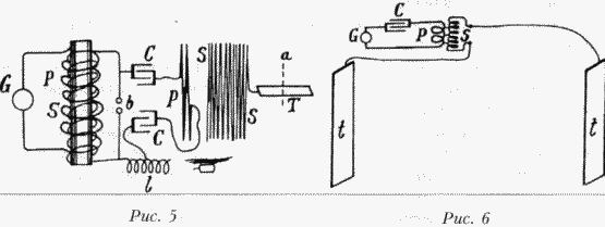 Схема подключения, используемая обычно, показана на рисунке 5, который, если учесть предыдущие рисунки, не требует объяснения. Конденсаторы СС соединены последовательно, заряжать и предпочтительно от повышающего трансформатора, но с большим или меньшим успехом можно также использовать высокочастотный генератор переменного тока, электростатическую машину или генератор постоянного тока. Первичная обмотка р, через которую проходят высокочастотные разряды конденсаторов, состоит из нескольких витков кабеля очень маленького сопротивления, а вторичная обмотка 5, желательно, чтобы она находилась на некотором расстоянии от первичной для того, чтобы обеспечить свободные колебания, одним концом – то есть тем, что ближе к первичной обмотке, – замкнута на землю, в то время как второй конец ее соединен с изолированным выводом Т, соединенным, в свою очередь, с телом пациента. В данном случае важно добиться синхронности колебаний в первичном и вторичном контурах р и s соответственно. Как правило, этого легче всего достичь путем изменения самоиндукции схемы, включив в нее первичную петлю или обмотку р, для чего предназначена регулируемая обмотка /; но в тех случаях, когда эдс генератора исключительно высока, например при использовании электростатической машины, конденсатор, состоящий всего лишь из двух пластин, имеет достаточную емкость, и проще достичь поставленной цели, меняя расстояние между пластинами.