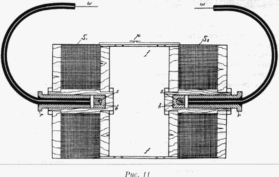 Длина каждой из вторичных обмоток рассчитывается таким образом, чтобы она составляла примерно четверть длины волны электромагнитного возмущения, происходящего во вторичной цепи, и основывается, конечно, на практическом расчете скорости прохождения этого возмущения через цепь. Само собой разумеется, что длина вторичной обмотки будет лишь приблизительно равна четверти длины волны в зависимости от того, какова емкость цепи при нормальных рабочих условиях. При обычном применении прибора для получения количественных эффектов разрядов высокого напряжения для емкости выводов делается небольшой допуск, но если прибор создан, например, для получения большого количества потоков между пластинами большой площади, либо для зарядки конденсаторов от вторичной обмотки, или для чего-то подобного, тогда длина провода вторичной обмотки делается значительно короче, и желательно, чтобы она уменьшалась в равной доле от четверти длины волны, которая возникает без какого-либо допуска на емкость, кроме емкости катушки. И наконец, если нужно получить токи сравнительно небольшого напряжения, обмотку следует изготовить из одной шпули и нескольких слоев, которые располагаются вблизи первичной обмотки для того, чтобы повысить коэффициент взаимной индукции и как можно более уменьшить резонансное повышение потенциала. Помещение магнитного контура в кислород при обычном или повышенном давлении, которое не имеет особого значения при наличии тока низкой частоты, оказывает серьезное воздействие при наличии токов такой необычно высокой частоты, в особенности в условиях, благоприятных для возникновения резонанса, и я предчувствую практическое применение кислорода в данном направлении.