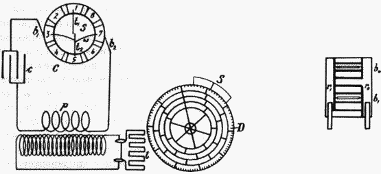 Работа этих приборов подобна той, что мы уже описывали. Когда начинает вращаться вал S, щетки b1b2входят в контакт с секторами 1 и 3, и конденсатор заряжается до потенциала, который можно настроить при помощи сдвига фиксатора щеток. Конденсатор сохраняет определенный заряд до тех пор, пока щетки b1b2не вступят в контакт с секторами 1 и 5, что вызывает колебательный разряд через первичную обмотку р, в результате чего во вторичной обмотке индуцируется сильный импульс тока, который моментально зажигает вакуумную трубку или искру в разряднике /, помещенном в непосредственной близости от диска D, вращающегося равномерно, как уже описано выше. По мере вращения контроллера щетки вновь входят в контакт с секторами 1 и 3, и всё повторяется, причем при каждом обороте вала происходит несколько импульсов в вакуумной трубке или в разряднике. В показанном на рисунке устройстве происходит всего два импульса на каждый оборот вала, но можно получить и большее их количество путем увеличения числа секторов и соединив их таким же образом. Следует заметить, что импульсы тока, которые поступают на конденсатор тогда, когда щетки b1b2 в контакте с теми секторами, которые соединены с обмоткой ротора, обычно не дают ощутимого эффекта на вторичной обмотке s. Так может произойти, если количество секторов будет очень большим, и это сразу станет заметным. Правильная настройка контура, через который разряжается конденсатор, конечно, желательна, но не необходима.
