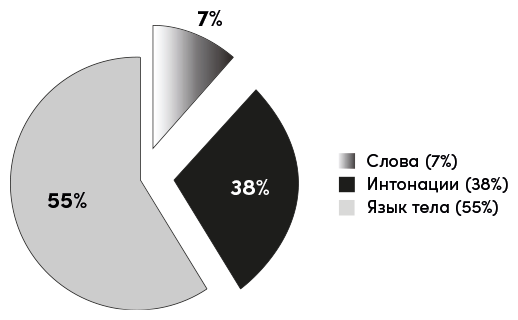 В 1967 г. Альберт Меграбян, почетный профессор психологии Калифорнийского университета в Лос-Анджелесе, провел исследование, результаты которого до сих пор широко цитируются. Он установил, что правдоподобность поведения зависит от конгруэнтности, то есть согласованности, трех аспектов коммуникации. В своей статье «Расшифровка неконсистентных коммуникаций» (Decoding of Inconsistent Communication) он представил процентное соотношение этих аспектов: так, по его данным, 55 % информации мы получаем и передаем посредством языка тела; 38 % приходится на интонации, и всего 7 % – на слова, которые человек произносит.