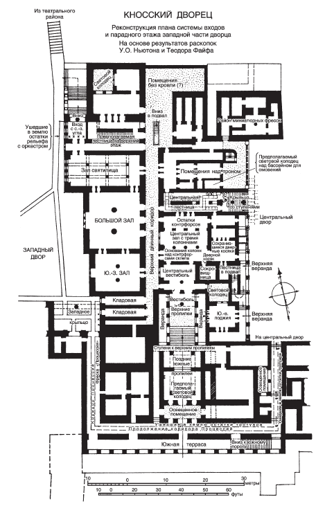 В годы расцвета минойской цивилизации на острове главенствовал Кносс. О его процветании выразительнее всего свидетельствует громадный Кносский дворец с величественными входами и залами, широкими лестницами и обширными кладовыми, изысканными росписями и превосходной кладкой. О значении религиозного культа свидетельствует святилище с колоннами на центральном дворе. Расположенная к югу от дворца изящная храмовая гробница (рис. 5, б), где из склепа с колоннами можно попасть в погребальную камеру, дает основания предположить, что в каком-то виде практиковался и культ умерших правителей Кносса. Согласно более поздней греческой традиции, правителя Кносса звали Минос, он был сыном Зевса и Европы, раз в девять лет советовался с Зевсом, а его супругой была Пасифая, дочь Солнца. Вполне вероятно, что правящие царь и царица Кносса брали себе такие имена в качестве династических титулов и обожествлялись, подобно современным им египетским фараонам. Возможно, на так называемом барельефе царь-жрец (с. 31) изображен Минос, царствовавший в XV в. О богатстве Кносса можно судить по широкому использованию минойскими ремесленниками драгоценных металлов и камней и по сокровищам из хранилищ дворца. Эти сокровища инвентаризированы на глиняных табличках по разновидностям и по стоимости. В хранилищах найдены и медные слитки, которые часто встречаются на острове. Эти слитки, без сомнения, были важны для торговли и, возможно, служили для обмена; однако никаких мелких денег не найдено. Процветание Кносса нельзя приписать исключительно эксплуатации природных ресурсов острова. Скорее всего, его источником являлась заморская торговля.