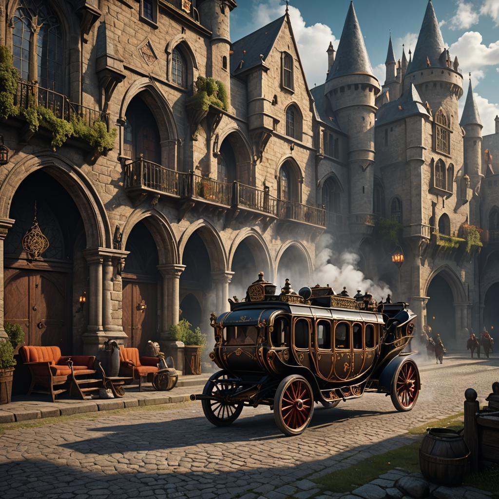 Мы подошли к стоящей неподалеку черной повозке, чтобы по размерам была больше похожа на небольшой трамвай. Устройство было больше и шире, чем транспорт, который я видел до этого. Один из рыцарей занял место водителя, в то время как остальные расселись по местам, в том числе и я. Вскоре я услышал какое-то потрескивание, звук выпускаемого пара и мы тронулись.