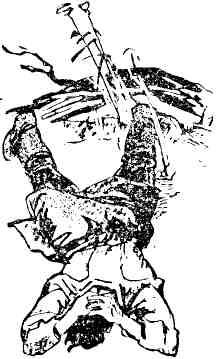 Кам, высокого роста, сухопарый старик, одетый в костюм с изображением мифического чудовища с четырьмя ногами и раздвоенным хвостом, бормотал над больной какие-то заклинания, ударяя колотушкой в бубен.