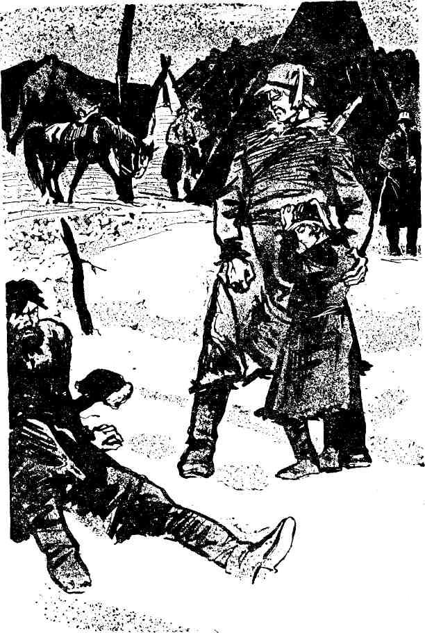 Делбек хотел было залаять, но Кирик, зажав пасть собаки, оттащил ее в кусты. Широкая спина и длинные руки человека показались Кирику знакомыми. Притаившись в густой траве, приятели стали наблюдать за сидящим. Рядом с ним лежал топор. Недалеко паслась оседланная лошадь. Незнакомец подбросил хвороста в огонь и повернул лицо в сторону ребят.