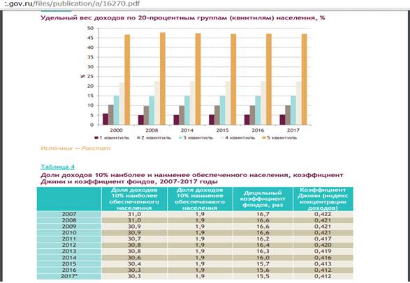 Как видим, этот коэффициент, который подтверждает то, что большинство населения и так знает, свидетельствует, что доходы в стране распределяются не так, как пытается представить нам государственная статистика. Коэффициенты, которые публикуются Аналитическим Центром при Правительстве РФ, служат больше пропаганде якобы цивилизованности в распределении доходов, чем отражают реальную действительность. Коэффициент 0,649, который выводится из статистики за 2017 г., ближе к 1, чем к 0, больше сближает Россию с ЮАР, чем с Европой, свидетельствует о том, что в стране процветает неравноправие в распределении доходов и богатства, об отсутствии стимулов для роста производства и отсутствии потенциала (из-за низкой покупательной способности) для развития рынка. При этом надо учесть, что мы не приняли во внимание многомиллионной армии безработных или частично занятых, перебивающихся случайными заработками. Ведь это благодаря им (точнее их отсутствию в списке занятых) поднимается планка среднемесячных доходов промежуточной группы между бедными и богатыми.
