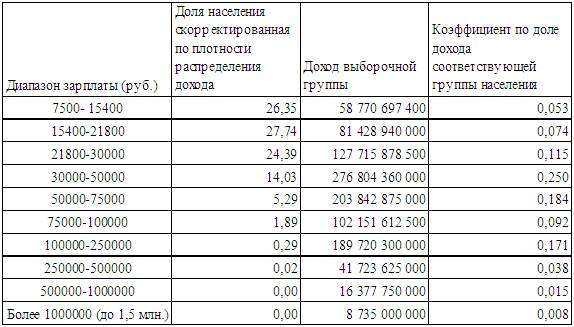 Теперь вспомним, что в апреле 2017 г. Росстат делал выборочный анализ распределения населения по доходам. Выборка была довольно представительная – 27 015 073 человека – 18,4% от общей численности населения. В этой выборке ощущалось предпочтение охвата тех, кто получал доход, близкий к среднему по стране. Это вызвало сомнение в репрезентативности, в связи с чем я в статье «Доля государства и Судьба человека», которая публиковалась ранее, приведённые данные Росстата поправил исходя из плотности распределения дохода по долям населения. При расчёте исходил из того, что МРОТ (на тот период 7500 руб.) встречается чаще, чем зарплата в 1–5 млн. рублей. Следовательно, чем больше МРОТ вписывается в диапазон, тем реже эта зарплата встречается. Отсюда получился поправочный коэффициент. Доход в группе посчитал, умножив число работников на средний заработок в данной группе. Например: (15400 + 7500)/2*численность работников в группе. В той статье меня интересовала средняя заработная плата. Сейчас интересует коэффициент, отражающий долю дохода в группе. Используя знакомые нам данные, определим коэффициент и сведём их в таблицу: