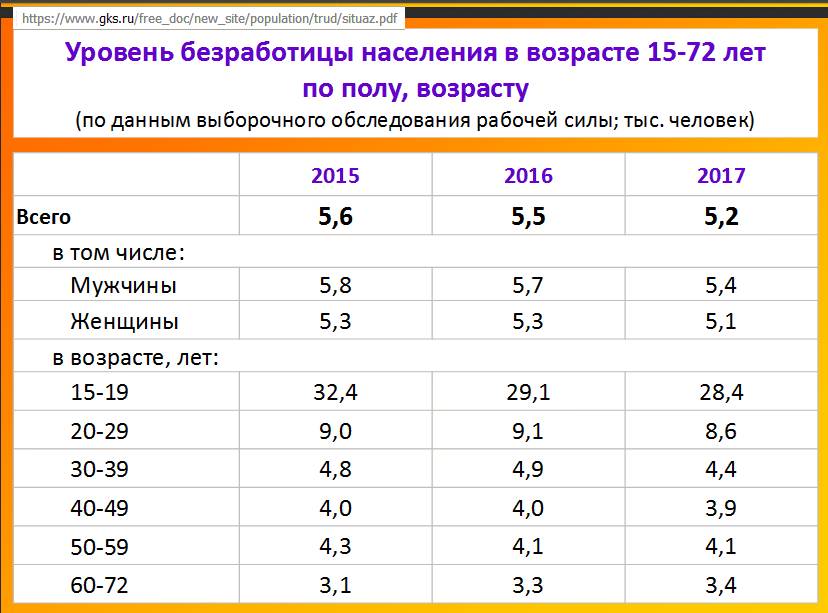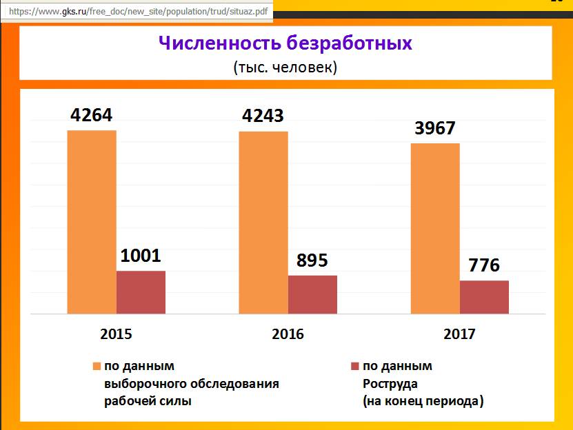 Налицо снижение численности безработных – удобная статистика. При этом в 2015 г. Роструд «ошибся», пользуясь методикой МОТ, в 4,3 раза (4264/1001), а в 2017 г. – в 5,1 раза (3967/776). Это означает только одно: всё реже люди регистрируются (или их регистрируют) в качестве безработных, т.к. пособия по безработице не гарантируют прожиточный минимум. И всё реже попадают в опросный лист. В Законе «О занятости населения в РФ» № 1032–1 от 19.04.1991 в редакции от 02.12.2019 в статье 31, п.4 сказано: «Период выплаты пособия по безработице не может превышать шесть месяцев в суммарном исчислении в течение 12 месяцев…». При этом надо 2 раза в месяц отмечаться. Отсюда делаем вывод: государство установило максимум трудностей, чтобы воспрепятствовать людям в регистрации в качестве безработных, и чтоб они шли зарабатывать любые копейки, если удастся устроиться самим. Через Центры занятости очень незначительное число относительно «неработающего» населения людей получили работу. Отсюда эффективность работы этих Центров не может быть оценена высоко.