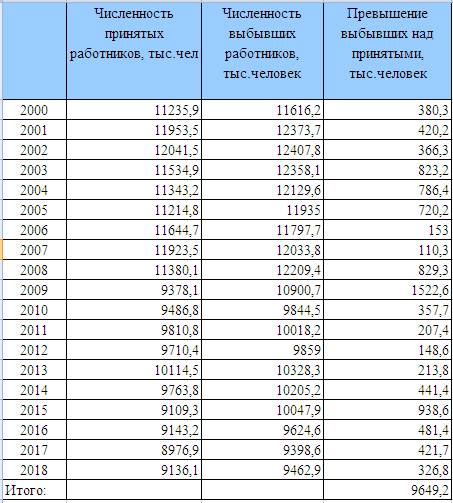 Как видим, число выбывших всё время превышало число принятых на работу. Таким образом, можно утверждать, что за 18 лет число рабочих мест сократилось ещё на 9649,2 тысячи. Если к ним прибавить более 9,094 млн. официально зарегистрированных безработных в 1999 г., мы получим число тех, кто никак не вписывается в статистику занятых и безработных. А нам сообщают, что за последние 15 лет было создано 6 млн. новых рабочих мест. Это значит, в первой колонке таблицы итоговая цифра должна была стать больше, а в третьей колонке меньше на 6 млн. Правда, есть и такой вариант: действительно было создано 6 млн. рабочих мест. Только они как открылись, так и закрылись. Или другая версия: рабочие места созданы, но отданы преимущественно иностранным специалистом, а наши специалисты подались на заработки за границу. В любом случае статистика, как её не приукрашивай, свидетельствует: сокращение числа рабочих мест налицо.